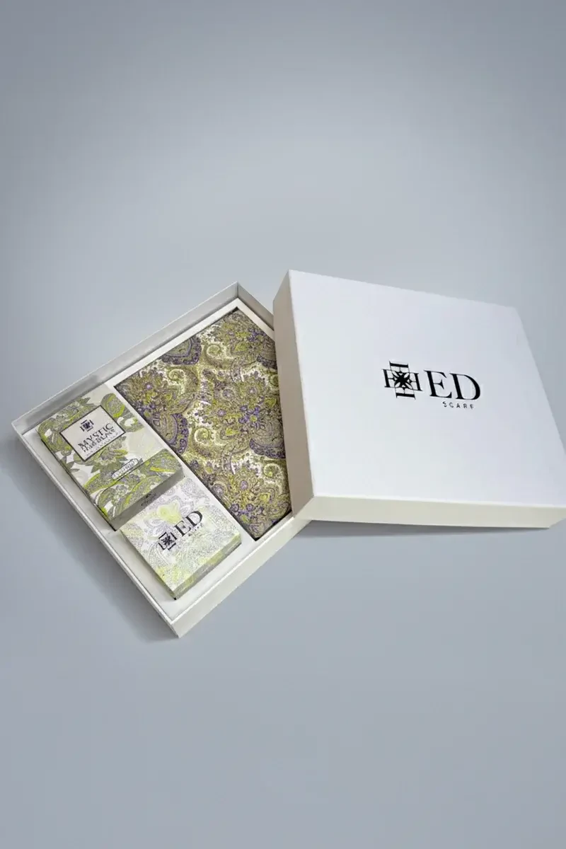 Bu hediye seti, müşterinin tercih ettiği şal ile kişiselleştirilmiş olarak tamamlanır. Şal sabit değildir, müşteri dilediği modeli sepete ekleyerek seti oluşturur. Şal sepete ücretsiz eklenir.